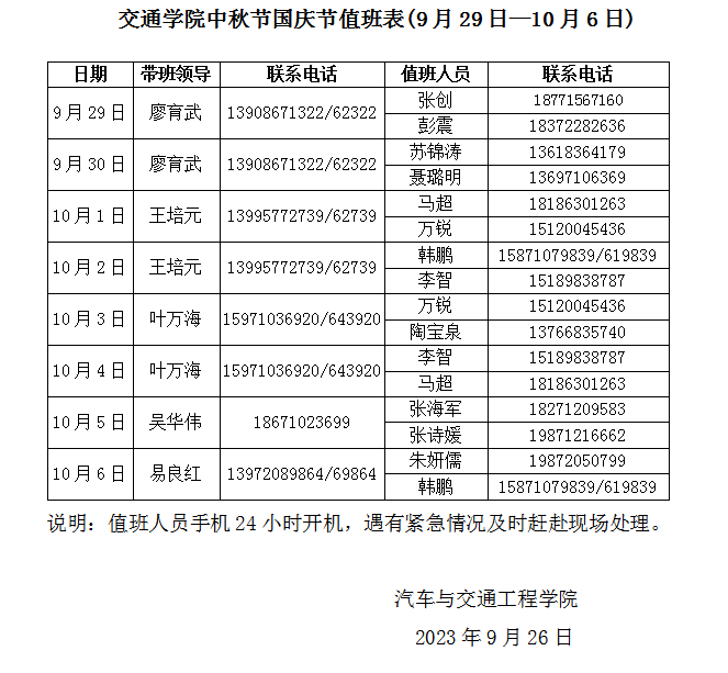 威廉希尔中秋节国庆节值班表(9月29日—10月6日)