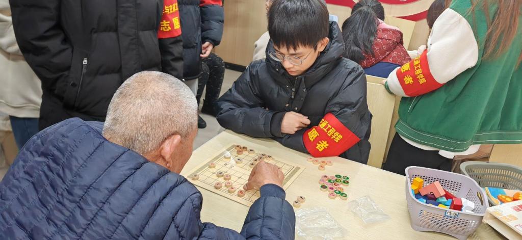 12月3日下午,志愿者到达敬老院后便开始分组行动。在棋盘旁,梅振同学发现一个慈祥的爷爷盯着棋盘,不禁走上前轻声询问。温和的爷爷兴致勃勃地邀请年轻人一起下棋,年轻人时而不解皱眉头,时而恍然大悟地笑了一下,时而陷入深思。爷爷则稳如泰山,耐心为年轻人指点迷津。棋局良久,最终爷爷胜出,梅振同学接连败下阵来,却好不自在。爷爷开怀大笑着对年轻人说:“年轻人,还需努力啊!” 这令围观的民众纷纷惊叹,称赞爷爷棋艺高超。