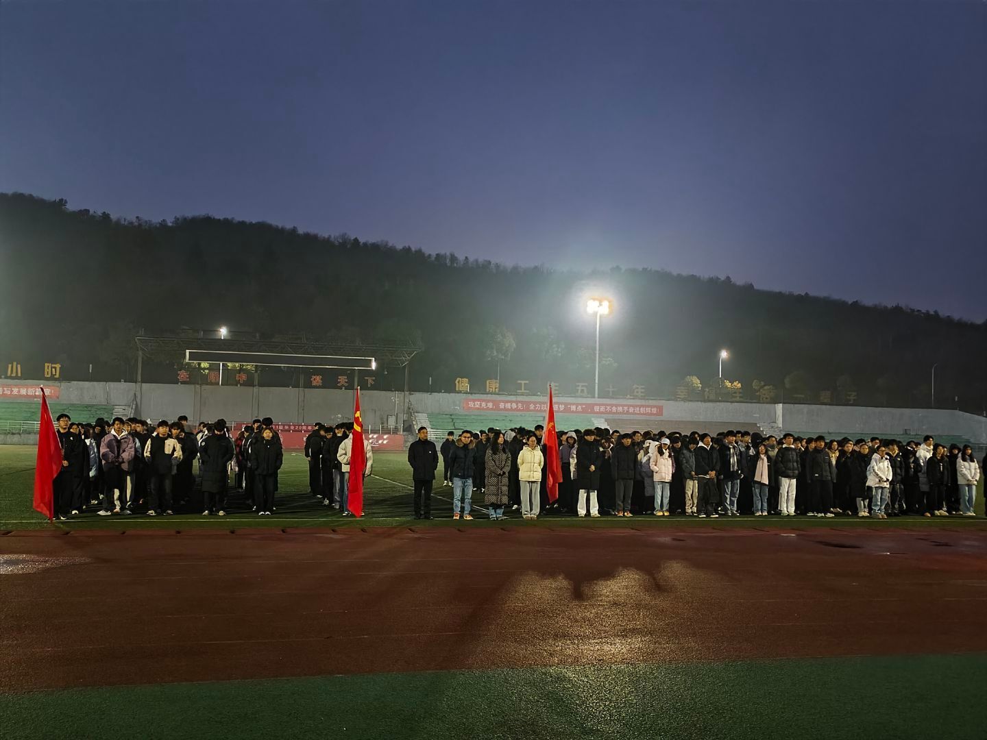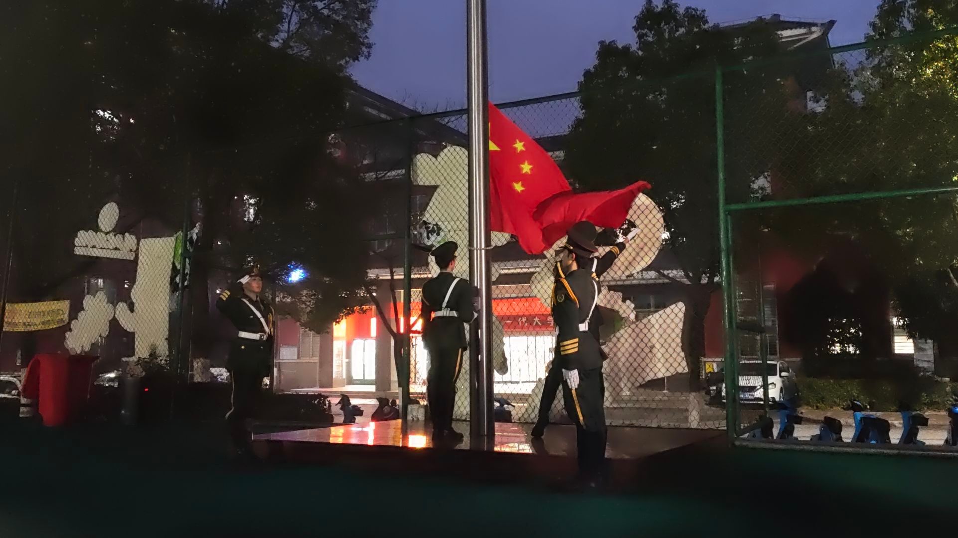 迎着凛冽的晨风,伴着雄壮的《义勇军进行曲》,五星红旗冉冉升起、迎风飘扬。全体师生庄严肃立,面向国旗行注目礼,高唱国歌,浓浓的爱国情怀在每个人心中激荡。