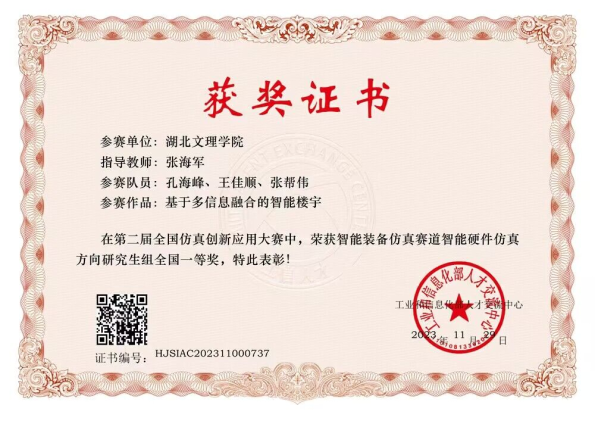 (通讯员 孔海峰 韩鹏)由工业和信息化部人才交流中心主办、全国仿真创新应用大赛组委会承办的2023年全国仿真创新应用大赛决赛于11月19日顺利闭幕,公司张海军老师指导的研究生团队(孔海峰、王佳顺、张邦伟)凭借作品“基于多信息融合的智能楼宇”,经过初赛选拔、省赛、国赛答辩等环节,最终荣获智能装备仿真赛道智能硬件仿真方向高校研究生组全国一等奖。