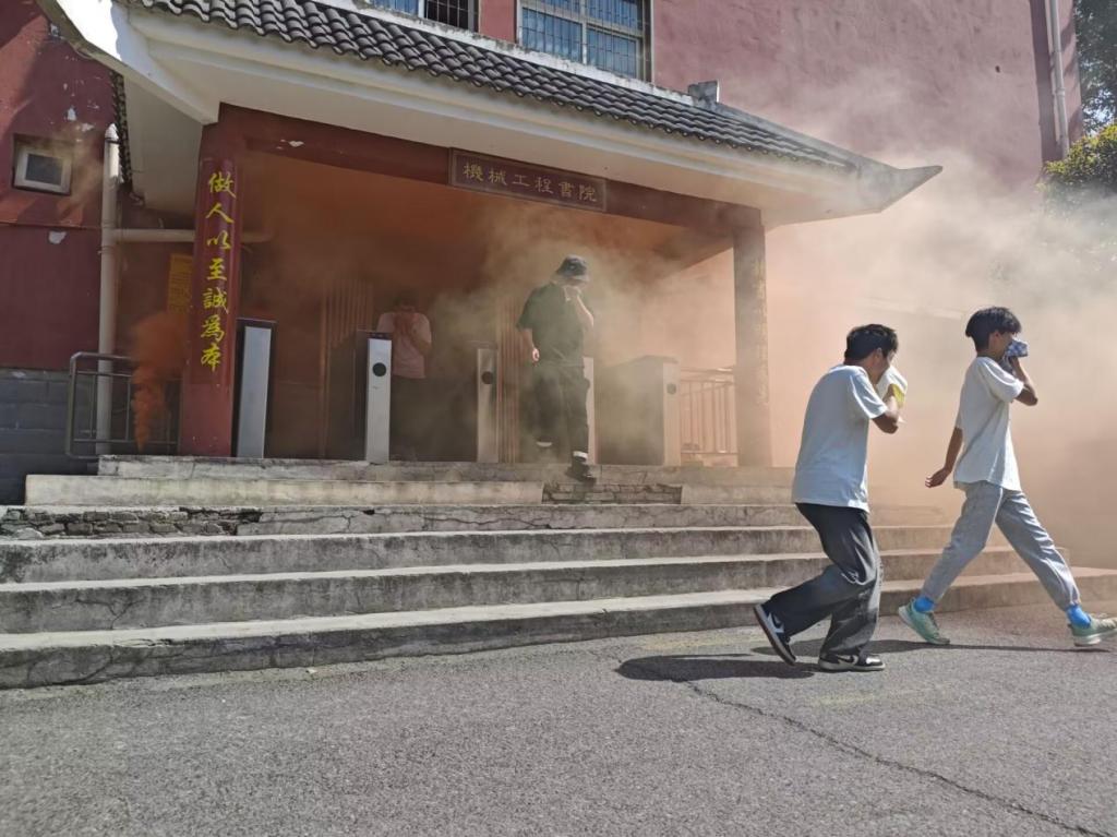 预设地点模拟起火,烟雾弥漫,警铃声响起,同学们沉着冷静,用湿毛巾捂住口鼻弯腰小跑前行,迅速有序疏散到达集合地点。