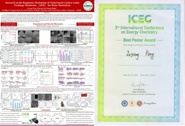 (威廉希尔 通讯员 张鹏飞)6月26-29日,第三届国际能源化学会议(The 3rd International Conference on Energy Chemistry, ICEC2025)在深圳举办。公司威廉希尔2024级研究生彭泽扬在贾志勇、张创两位老师的指导下,携研究成果《Research on the Regulation Mechanism of Nickel based Catalyst Anion Exchange Membrane(AEM) for Water Electrolysis》参会并做墙报交流。